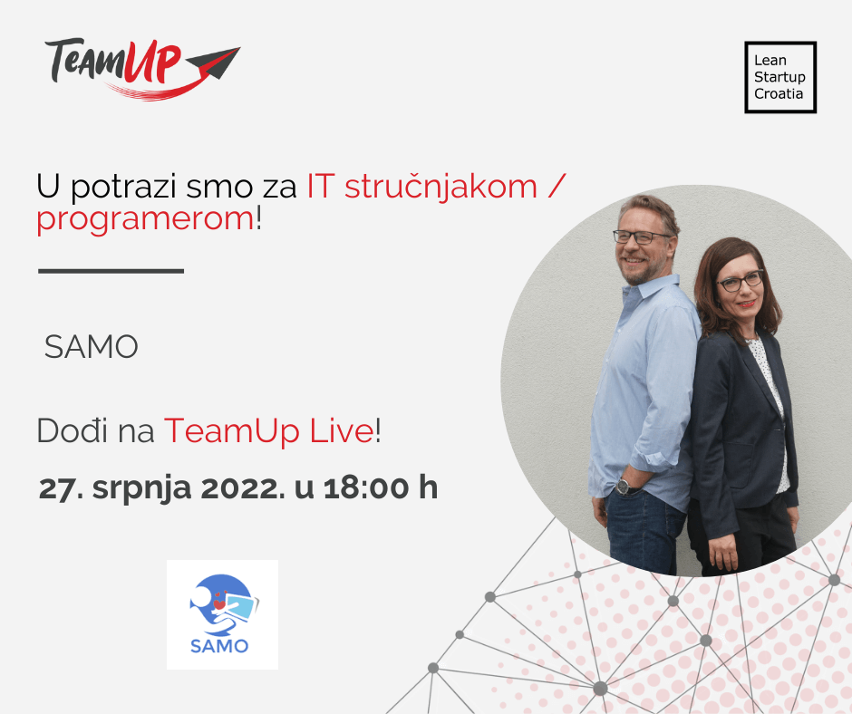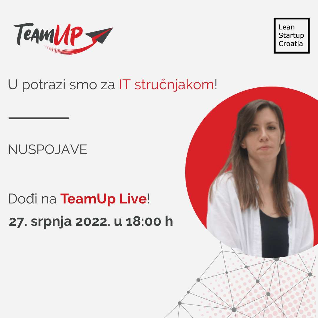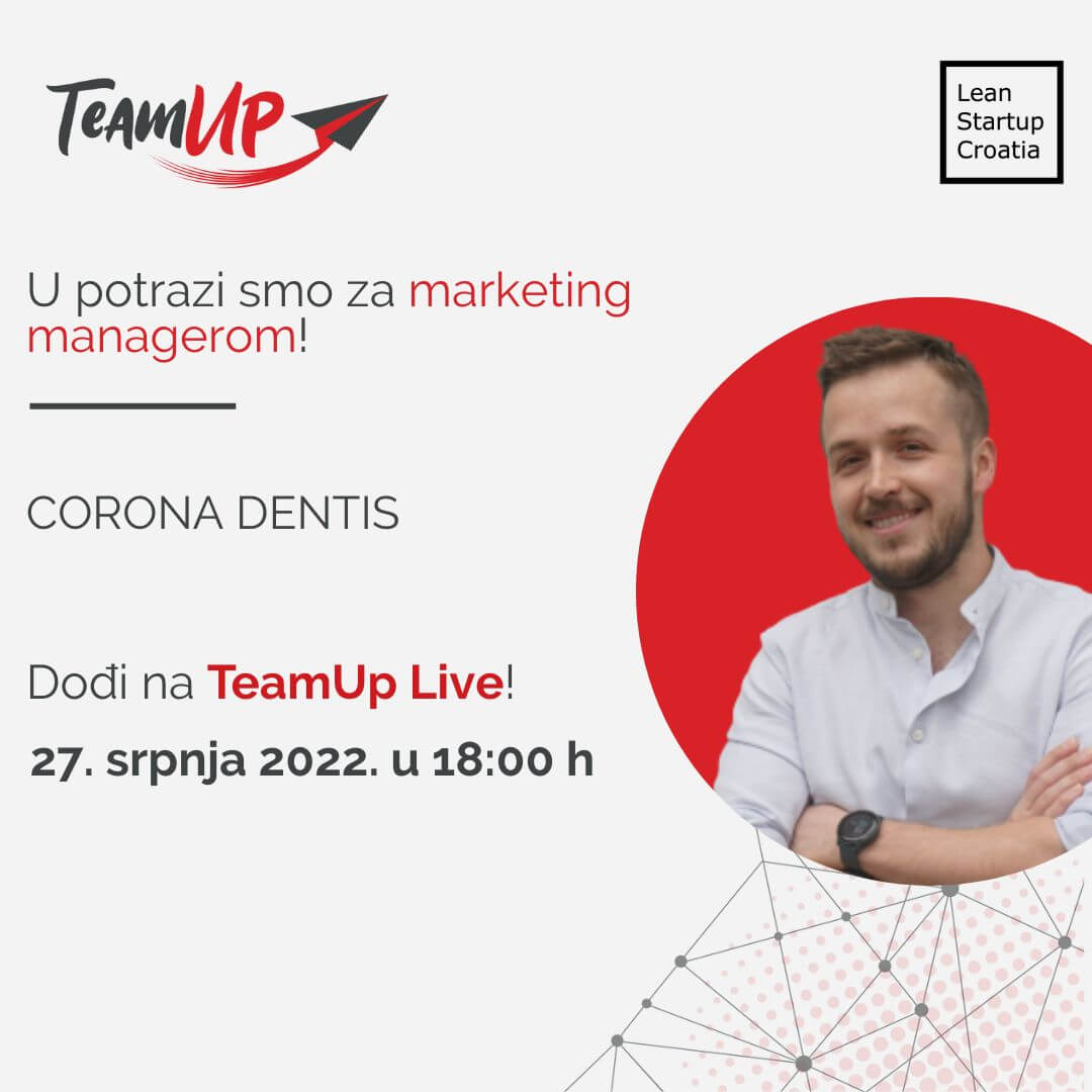 TeamUp Live je jedinstven događaj osmišljen kako bi startupe u ranoj fazi povezao sa svojim prvim suosnivačima, suradnicima i zaposlenicima. Isto tako, TeamUp pruža priliku svim pojedincima koji se žele okušati u startup poduzetništvu da to i učine. Ovoga puta, tema je zdravstvena industrija stoga će panelisti Antonio Meić, izvršni direktor, Motherverse